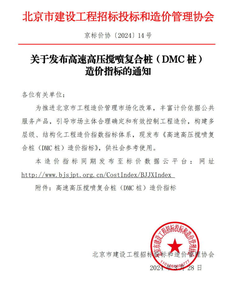北京市建设工程招标投标和造价管理协会发布《关于发布高速高压搅喷复合桩(DMC桩)造价指标的通知》