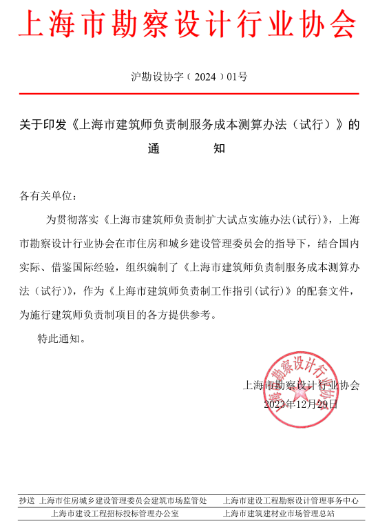 为贯彻落实《上海市建筑师负责制扩大试点实施办法(试行)》,上海市勘察设计行业协会在市住房和城乡建设管理委员会的指导下,结合国内实际、借鉴国际经验,组织编制了《上海市建筑师负责制服务成本测算办法(试行)》,作为《上海市建筑师负责制工作指引(试行)》的配套文件,为施行建筑师负责制项目的各方提供参考。