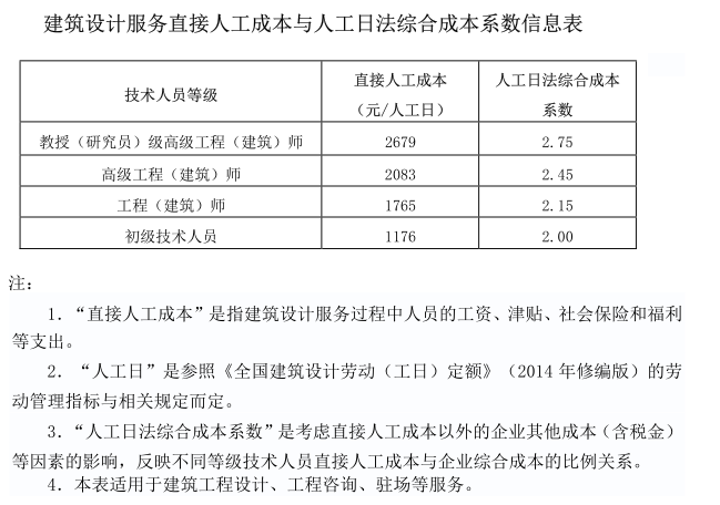 该方法根据投入的人工日数量和事先确定的人工日单价计算成本。人工日单价取决于相关技术人员的等级及经验。中国勘察设计协会【2016】9号《关于建筑设计服务成本要素信息统计分析情况的通报》中所列“建筑设计服务直接人工成本与人工日法综合成本系数信息”作为人工日法计费的参考依据。