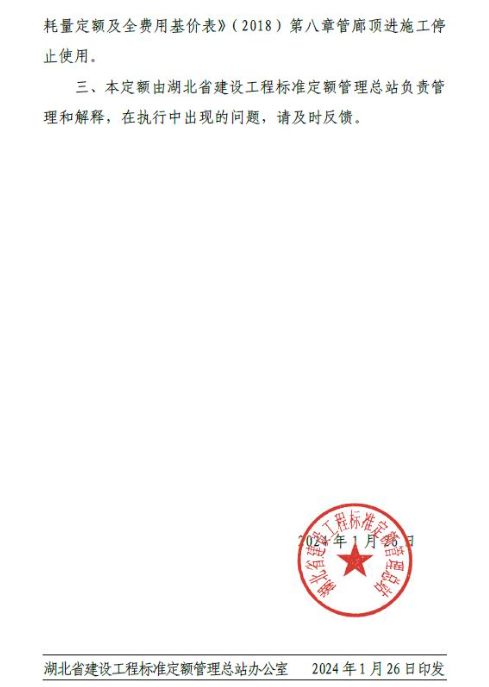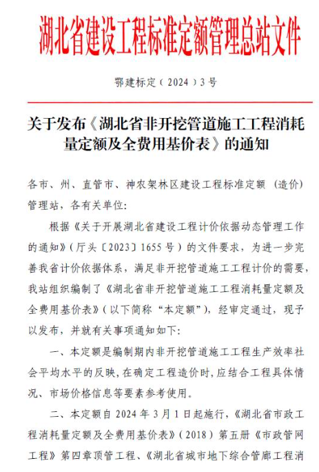 湖北省建设工程标准定额管理总站《关于发布<湖北省非开挖管道施工工程消耗量定额及全费用基价表>的通知》(鄂建标定〔2024〕3号)