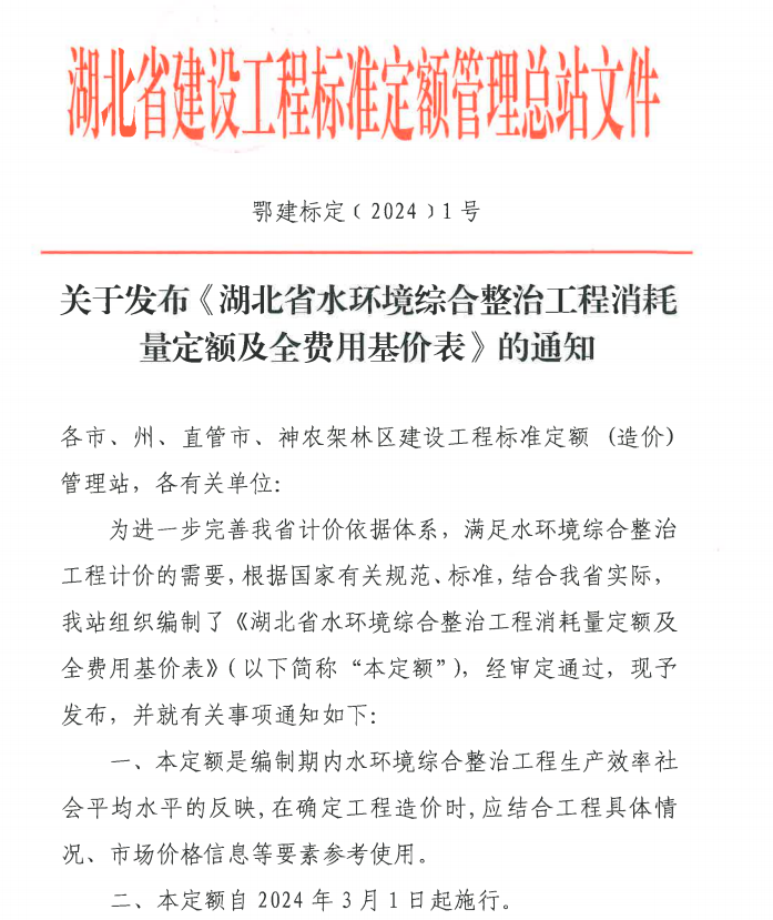 湖北省建设工程标准定额管理总站《关于发布<湖北省水环境综合整治工程消耗量定额及全费用基价表>的通知》(鄂建标定(2024)1号)