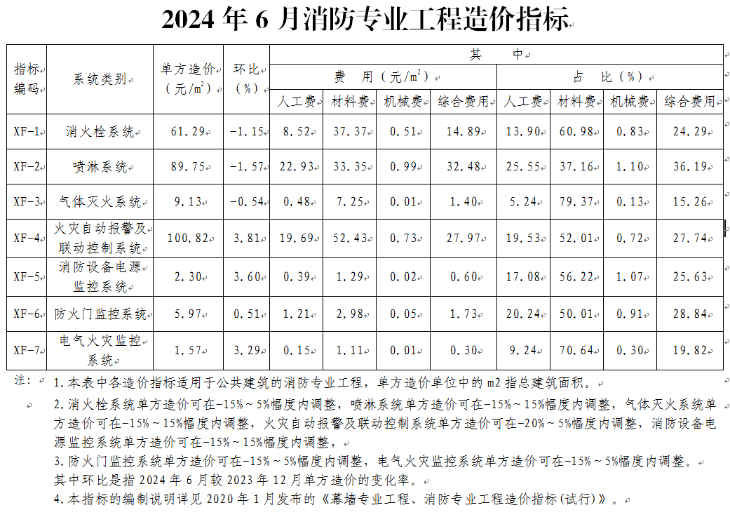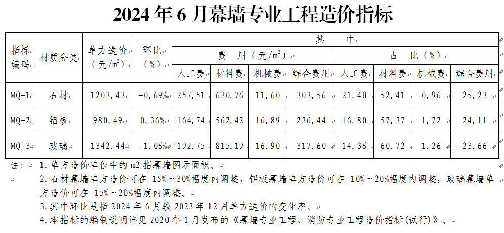 北京市住房和城乡建设委员会发布《2024年6月幕墙专业工程、消防专业工程造价指标》