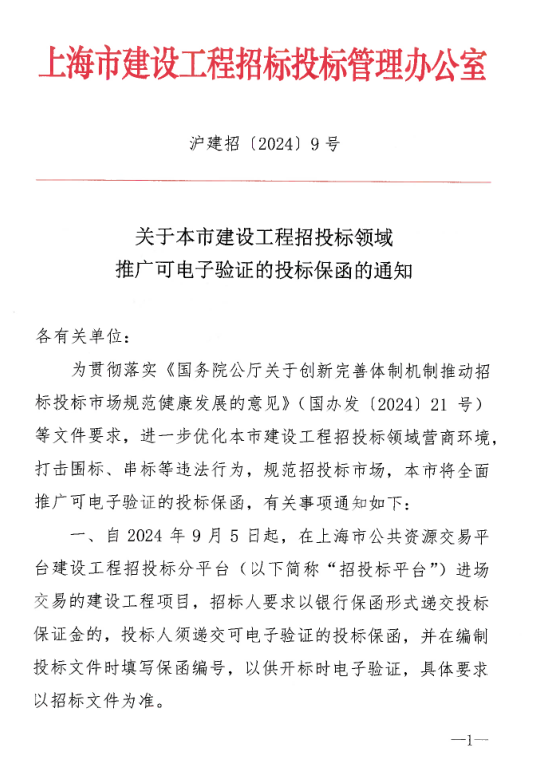 为进一步优化本市建设工程招投标领域营商环境,打击围标、串标等违法行为,规范建设工程招投标市场,2024年8月30日,上海市建设工程招标投标管理办公室印发了《关于本市建设工程招投标领域推广可电子验证的投标保函的通知》(沪建招 〔2024〕9号),就推行可电子验证的投标保函的时间、投标保函银行名录、投标保证金评标委员会评审依据等事宜做出相关要求(详见文末附件)。