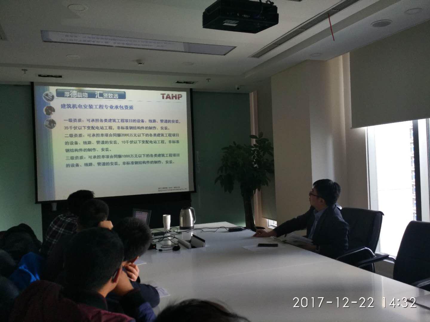 20171222日下午,工程部在公司大会议室进行了第三次业务培训,由崔红强主讲了《精装修施工应注意的事项》。崔工结合我公司的多个精装修项目工程实例和多张现场实景照片,讲解了精装修施工中应该控制的关键点及设计与施工过程中管控的要点,难点及应注意的事项。