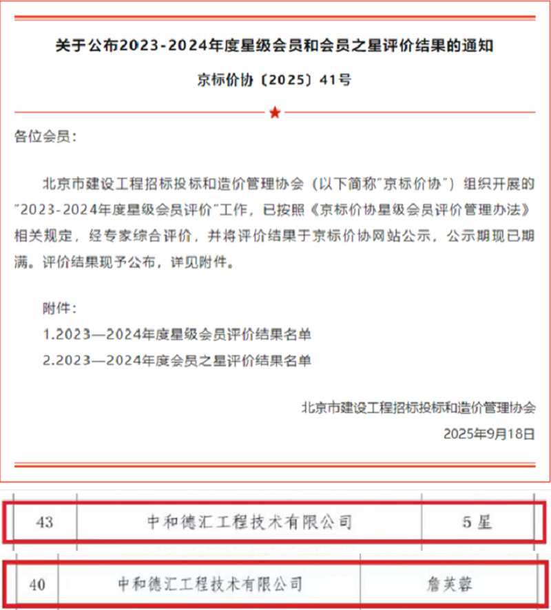 近日,北京市建设工程招标投标和造价管理协会正式公布2023-2024年度星级会员和会员之星评价结果,我司凭借扎实的专业能力、规范的服务流程与卓越的行业口碑,成功斩获“5星级单位”的最高荣誉称号,我司行业专家詹芙蓉凭借多年深耕专业领域荣获“会员之星”的荣誉称号。这标志着公司综合实力获得行业权威机构的高度肯定。