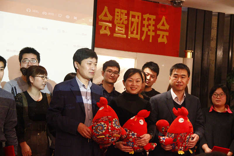首先,由王维东总经理致辞,王总首先就2016年度公司发展做了全面客观的总结,并提出了2017年的发展思路。紧跟着由谭挺副总经理宣布2016年度优秀员工表彰通知,并由詹芙蓉董事长和王维东总经理、副总经理段少佐、总经理助理郑小亚共同为优秀员工颁奖,因今年是三位领导的本命年,优秀员工特为三位领导准备了礼物,祝愿咱们领导彩凤高翔,带领德汇在新的一年傲视群英,雄视天下。